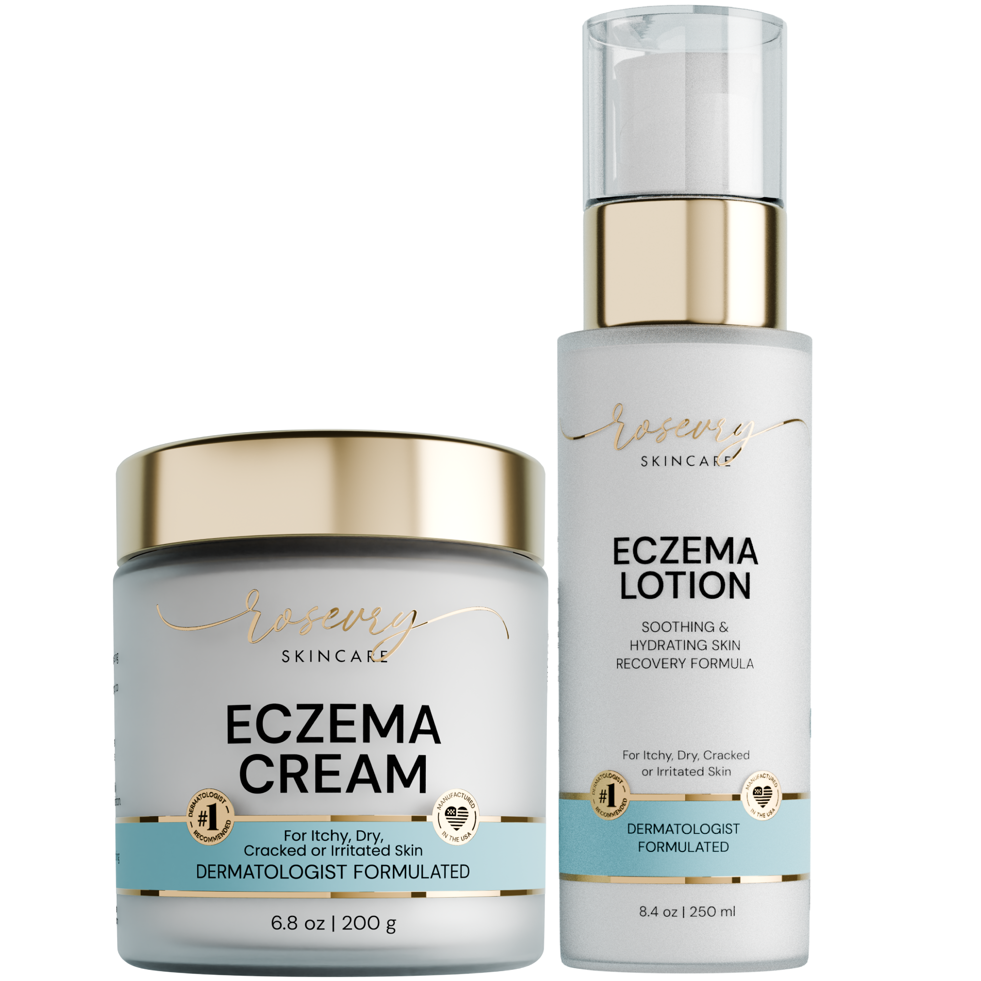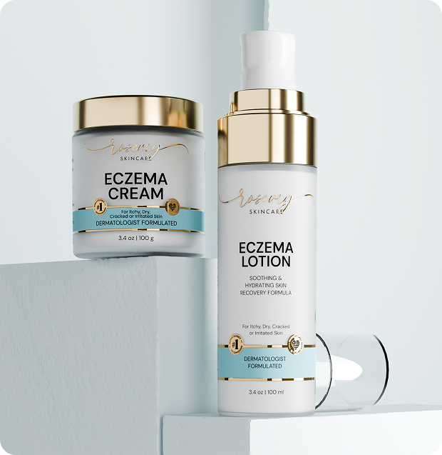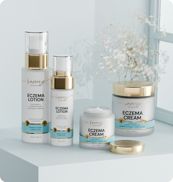 Combines the intensive care of the Rosevry Eczema Relief Cream with the daily hydration of the Eczema Soothing Lotion — your complete solution for calm, comfortable skin.